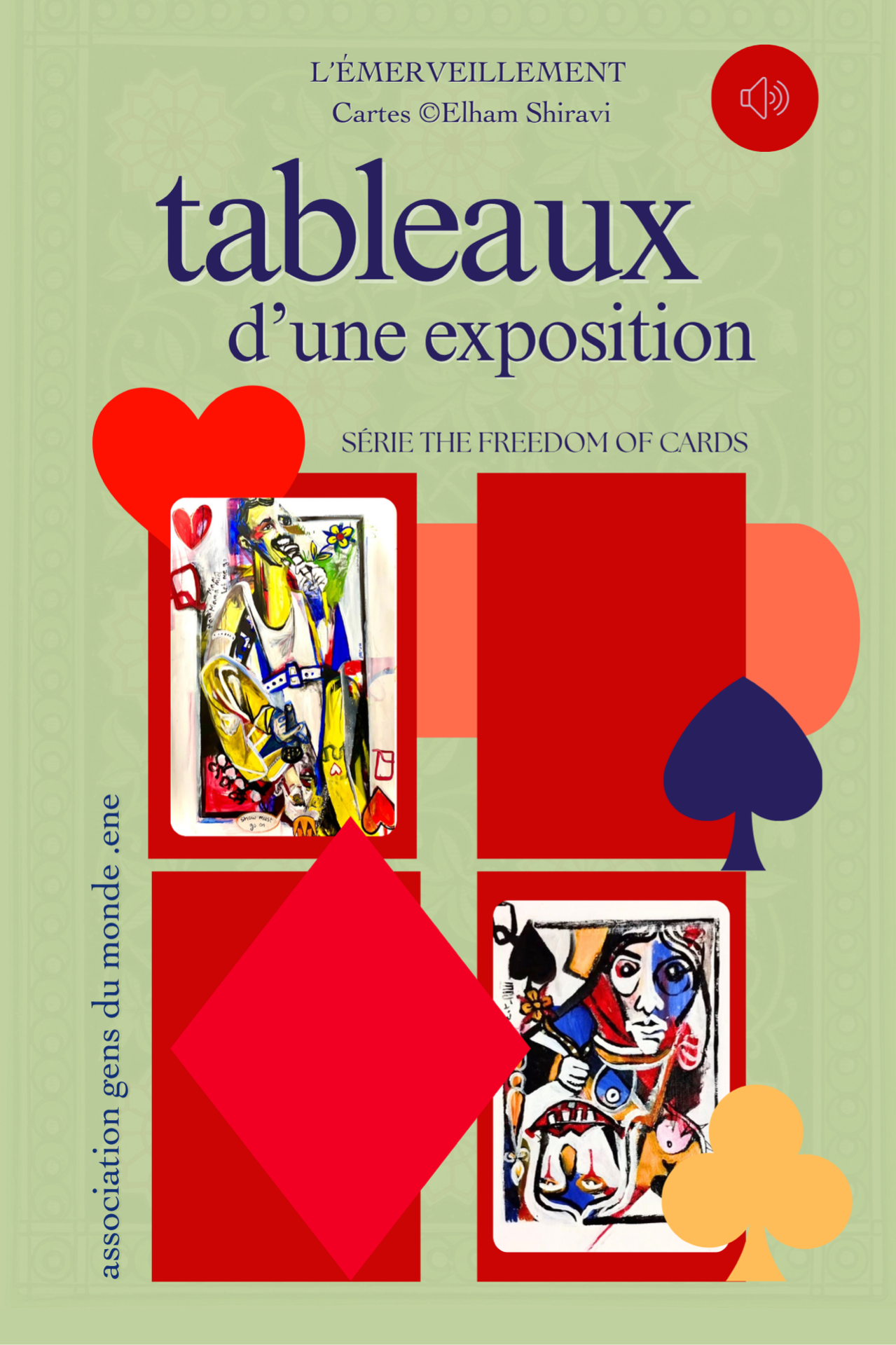Gens du Monde souhaite également accompagner l'insertion d'artistes étrangers, invités de haut niveau. Ainsi la création d'un JARDIN DES CARTES, objet visuel, écrit et audio français/persan d'après la série THE FREEDOM OF CARDS de l'artiste Elham Shiravi (peintre) dans le cadre de notre thématique L'ÉMERVEILLEMENT, projet 2026 : TABLEAUX D'UNE EXPOSITION. Le livre (format 10x15) comportera un jeu de cartes inédit en résonance avec des poèmes de Saadi, Hafez, Rumi et Khayyam, lus en persan et français avec une musique originale (à retrouver par Qr Codes).
